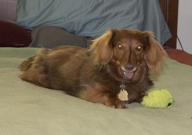 Previous Image Next Image _DSC0593 “I hazza ball!!!” Sarah grinning on the bed with a chewed up tennis ball