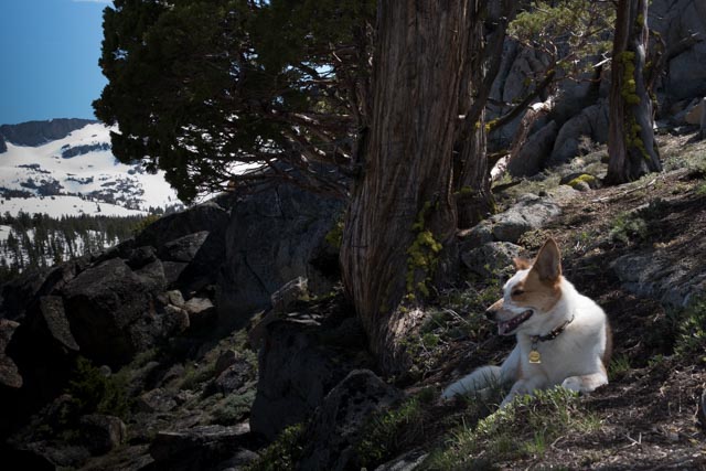 Previous Image Next Image _DSC0990 Pippi admiring the view in the shade of a Juniper tree. Carson Pass. Pippi relaxing under a Juniper tree on the way down from Red Lake Peak. She is admiring the view.